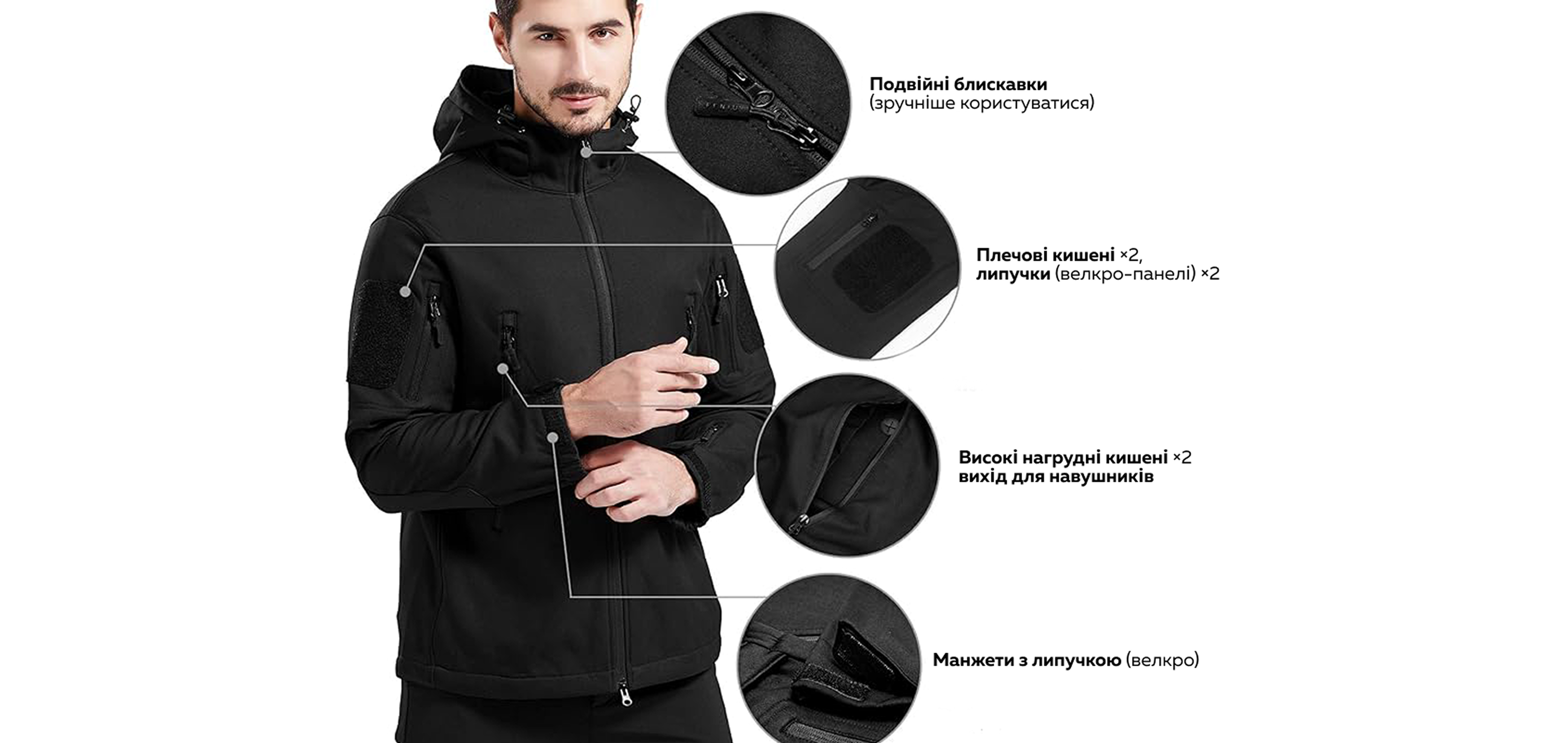 Основою куртки є Soft Shell — сучасна багатошарова тканина, стійка до стирання, розтягування та механічних навантажень. Внутрішній шар із м'якого флісу утримує тепло, водночас даючи змогу тілу «дихати».