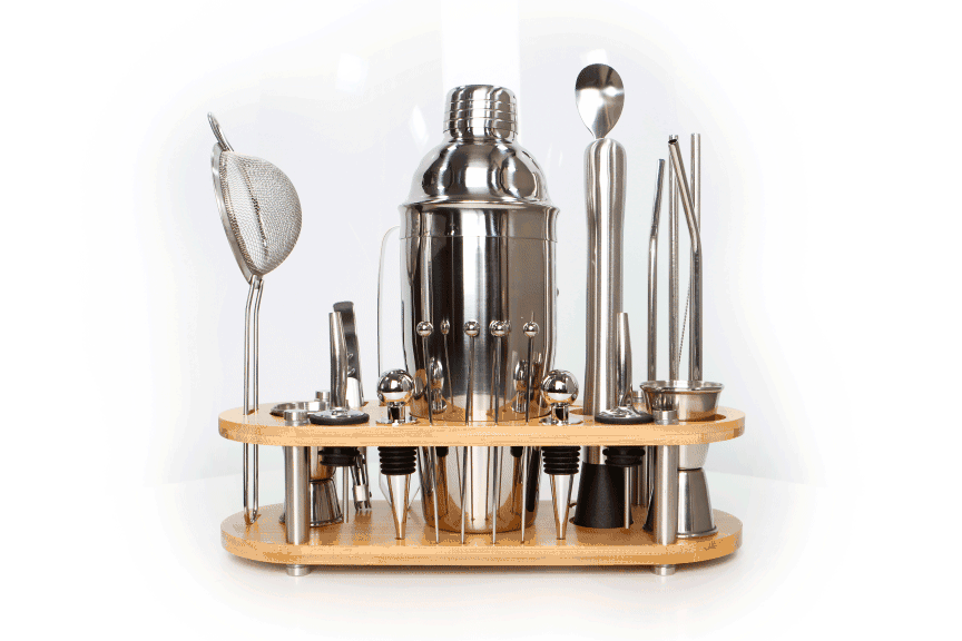 | Комплектація | Шейкер; Джиггер (2 шт.); Стрейнер; Гейзер (2 шт.); Щипцы; Пробка (2 шт.); Сито; Трубочки (4 шт.); Шпажки (4шт); Ложка барна; Штопор; Йоржик; Підставка |