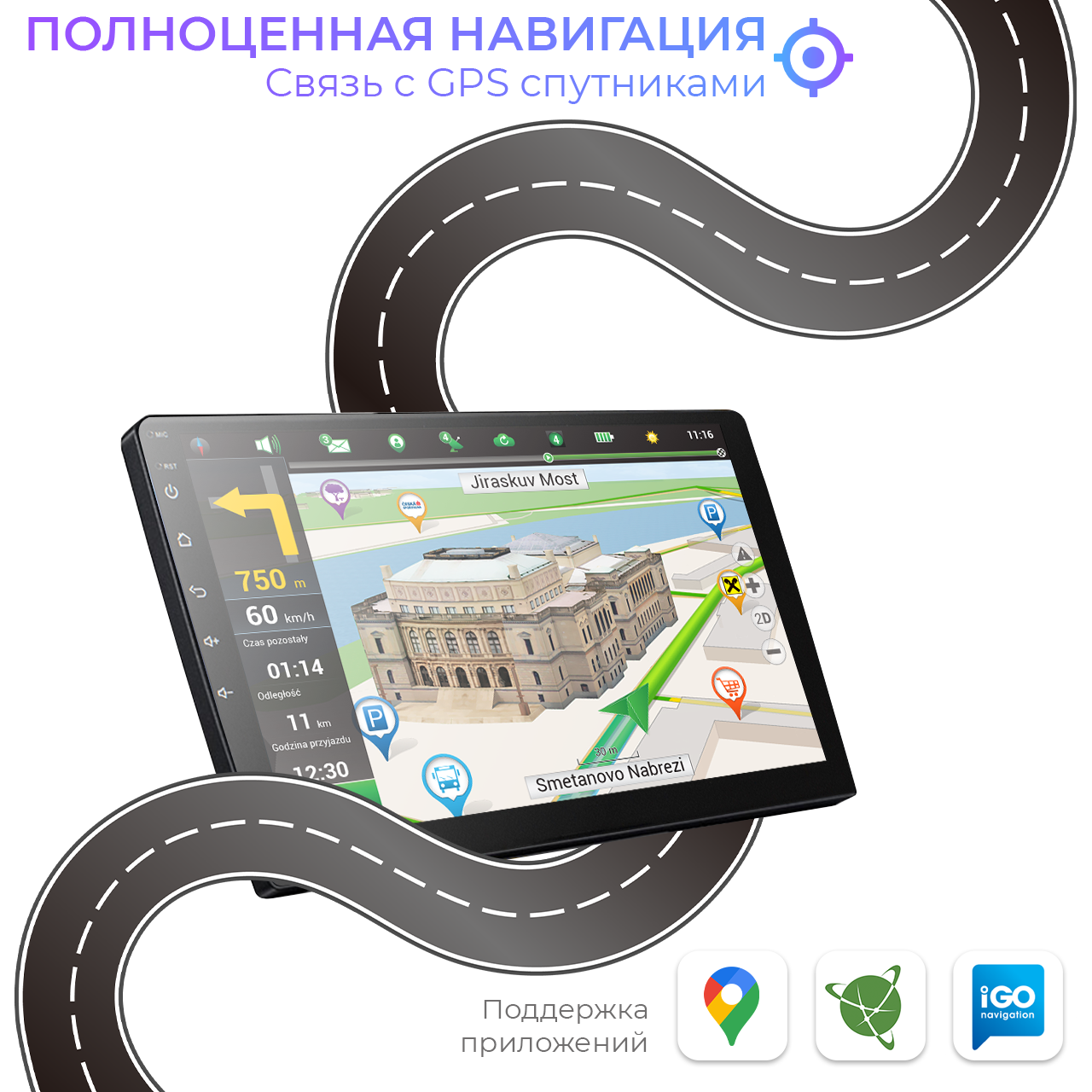 Встановивши автомагнітолу, ви можете забути про використання навігатора як окремого пристрою, адже автомагнітола завдяки своєму програмному складнику перевершує більшість зовнішніх навігаційних систем. Стабільність зв'язку з супутниками забезпечується зовнішньою антеною, яку ви можете закріпити у верхній частині салону авто, наприклад, із внутрішньої сторони лобового скла, у такий спосіб досягається максимально можливий рівень сигналу, що можливий в дорозі. Щодо навігаційного програмного забезпечення, тут ОС Android надає повну свободу дій, ви можете використовувати як за замовчуванням встановлений застосунок, так і завантажити більш придатний особисто вам зі вбудованого Play Market, ви більше не обмежені одним застосунком навігації як у разі зовнішніх навігаторів.