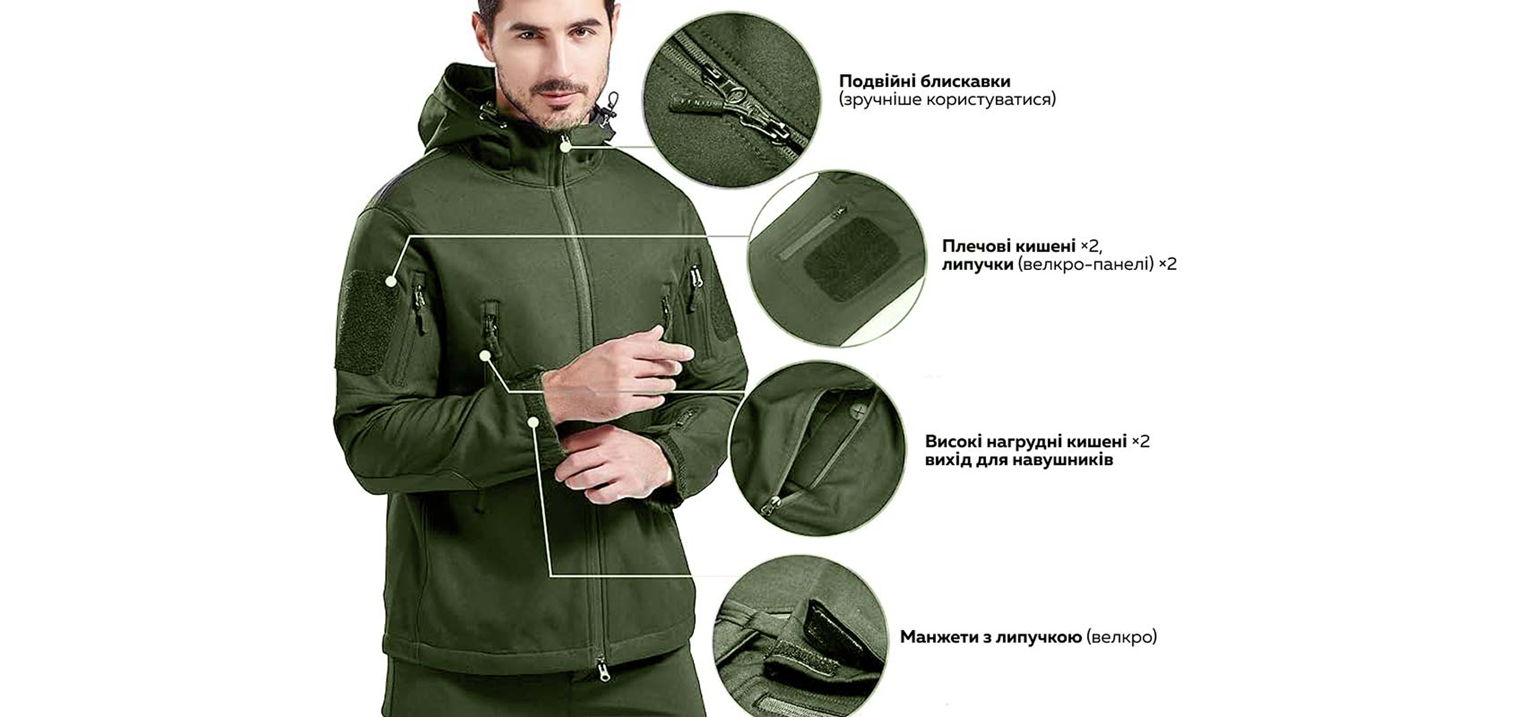 Основою куртки є Soft Shell — сучасна багатошарова тканина, стійка до стирання, розтягування та механічних навантажень. Внутрішній шар із м'якого флісу утримує тепло, водночас даючи змогу тілу «дихати».