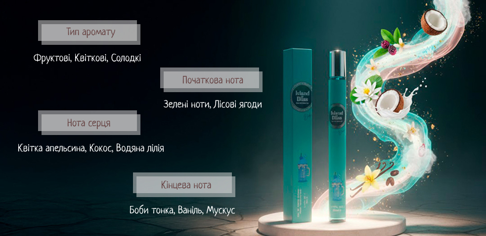 Аромат відкривається ігристими нотами соковитих фруктів, що дарують миттєвий заряд енергії та позитиву. Ви відчуєте солодкість стиглого манго та свіжість цитрусових, які створюють навколо вас ауру літнього свята. Цей старт звучить дуже природно та апетитно, привертаючи увагу оточуючих своєю невимушеною життєрадісністю. Фруктова свіжість Island Bliss ідеально підходить для спекотних днів, роблячи ваш образ легким і водночас привабливим.